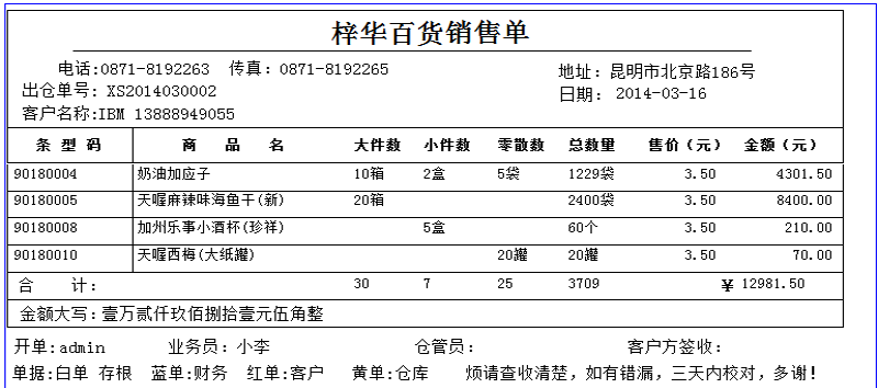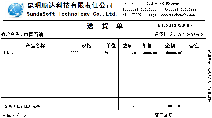 琦順達(dá)送貨單打印軟件具有數(shù)據(jù)自動(dòng)記憶功能:您開過的送貨單不在需要重復(fù)錄入,您開過單的的客戶信息自動(dòng)保留到客戶資料庫(kù)中,您給任何一個(gè)客戶的產(chǎn)品售價(jià)自動(dòng)記錄并在當(dāng)次開單時(shí)自動(dòng)提示、同一張送貨單,可打印為簡(jiǎn)體,也可以打印為繁體等等,能夠做到了您所想不到的細(xì)致功能。送貨單號(hào)由系統(tǒng)自動(dòng)生成(可按年+月+日+流水號(hào)等多種格式生成送貨單號(hào)),充分利用強(qiáng)大的數(shù)據(jù)庫(kù)功能給工作帶來(lái)的便利,真正的方便實(shí)用。系統(tǒng)內(nèi)置強(qiáng)大的權(quán)限管理功能,真真正正的讓您從此告別手工抄寫送貨單和使用EXCEL做月結(jié)的煩惱,打印出整齊漂亮的送貨單,同時(shí)還能即時(shí)管理商品庫(kù)存存貨和客戶欠款。